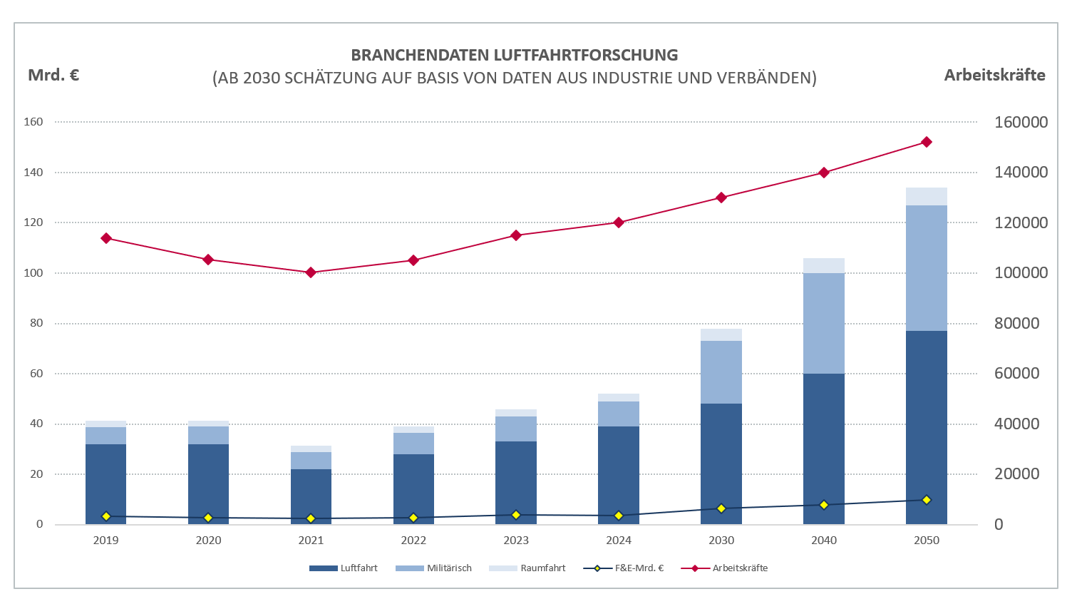 Der zusätzliche Bedarf an Flugzeugen bietet ein enormes Potential für den Arbeitsmarkt in der Luftfahrtindustrie. Heute sind in Deutschland ca. 100.000 Arbeitsplätze in der Luftfahrtbranche mit einem Wertschöpfungsvolumen von ca. 40 Mrd. € vorhanden. Die Verdopplung der Luftfahrt bis 2050 eröffnet grundsätzlich die Chance, dass auch in Deutschland ein kräftiger Aufwuchs an Arbeitsplätzen sowie Wertschöpfung stattfinden kann. Damit diese Chance ergriffen werden kann, sollen im Rahmen der Neuausrichtung des Luftfahrtforschungsprogramms LuFo die dafür notwendigen technologischen Fähigkeiten entwickelt werden. Insgesamt ist ein Aufwuchs der Arbeitsplätze in den kommenden 15 Jahren auf 140.000 Arbeitsplätze möglich. Einberechnet sind hierin die notwendigen Produktivitätssteigerungen im zivilen Sektor sowie der Ausbau im militärischen Bereich.
